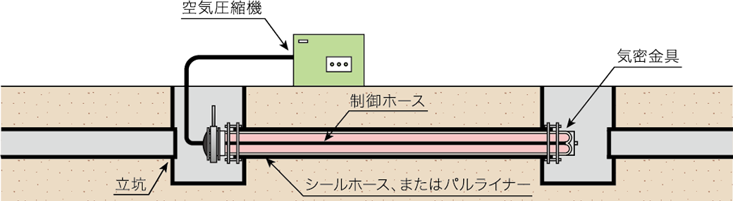 シールホースまたはパルライナーを空気圧で反転させることにより、上水道管路内面に密着させながら挿入します。
